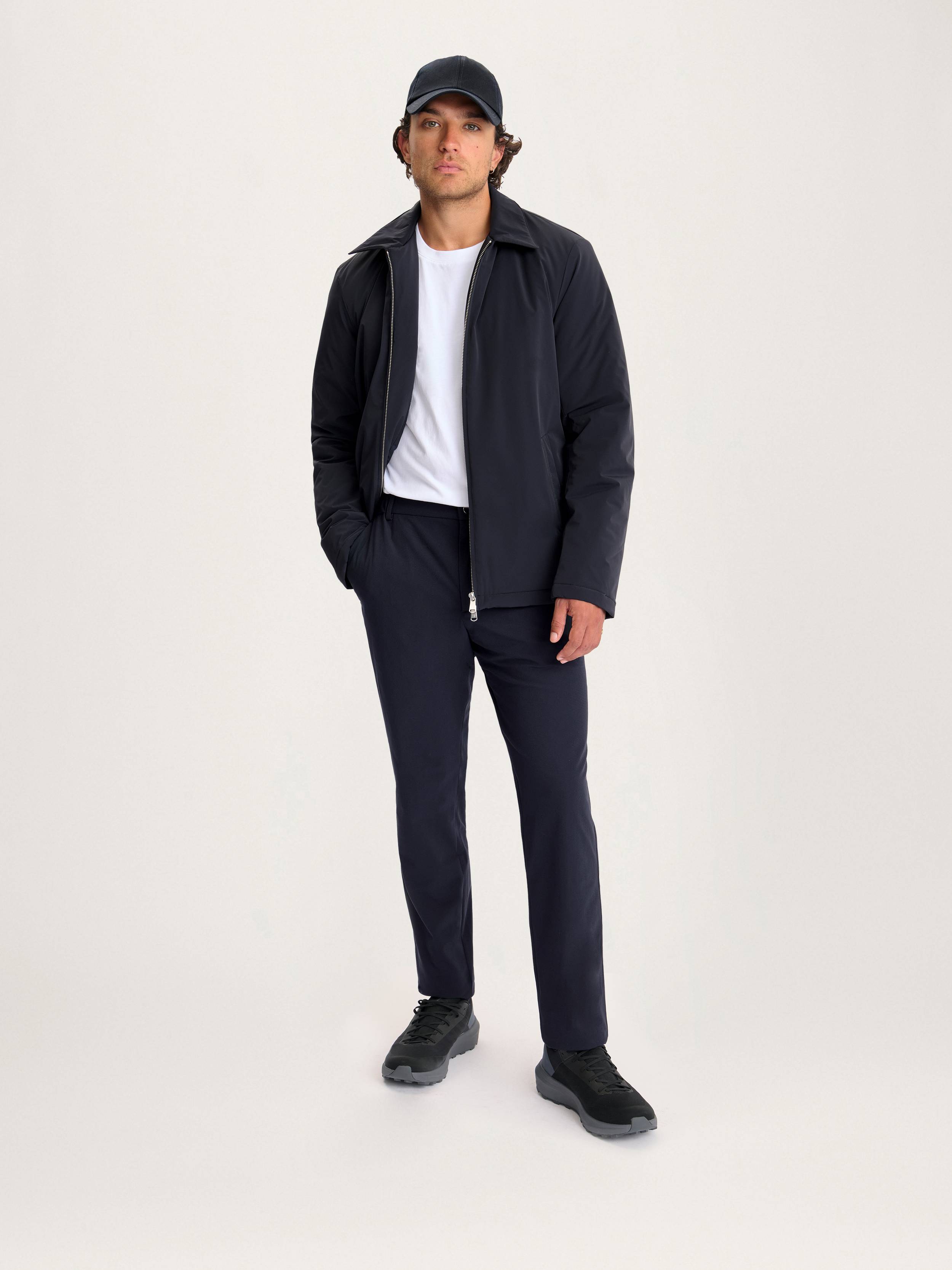 Man wearing Lestrange 360 Thermal Jacket in navy, minimalist insulated jacket with zip closure and pointed collar