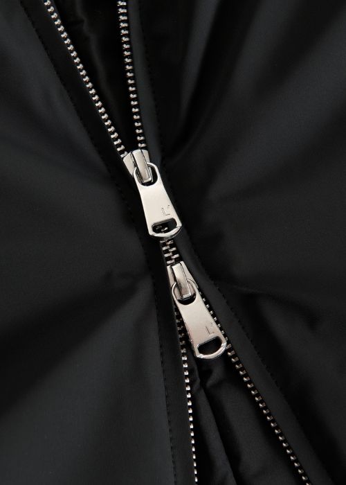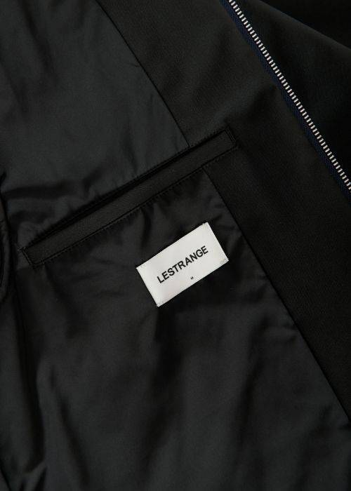 Close-up of model wearing Lestrange 360 Thermal Jacket in black, minimalist insulated outerwear with pointed collar and silver zipper. Model wearing Lestrange 360 Thermal Jacket in black, styled with black trousers, dark sneakers, and a minimalist casual look Back view of Lestrange 360 Thermal Jacket in black, lightweight insulated jacket with clean minimalist design. Close-up of model wearing Lestrange 360 Thermal Jacket in black, minimalist insulated outerwear with pointed collar and silver zipper." Side view of Lestrange 360 Thermal Jacket in black, insulated men’s jacket with zip front and side pockets