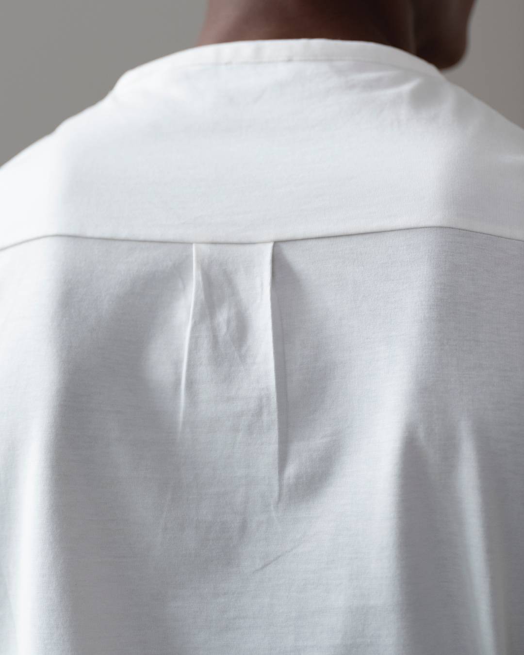 Made from organic cotton, with 160GSM and a structured feel – designed with a back-pleat for increased movement, a subtle curved hem and split sides.